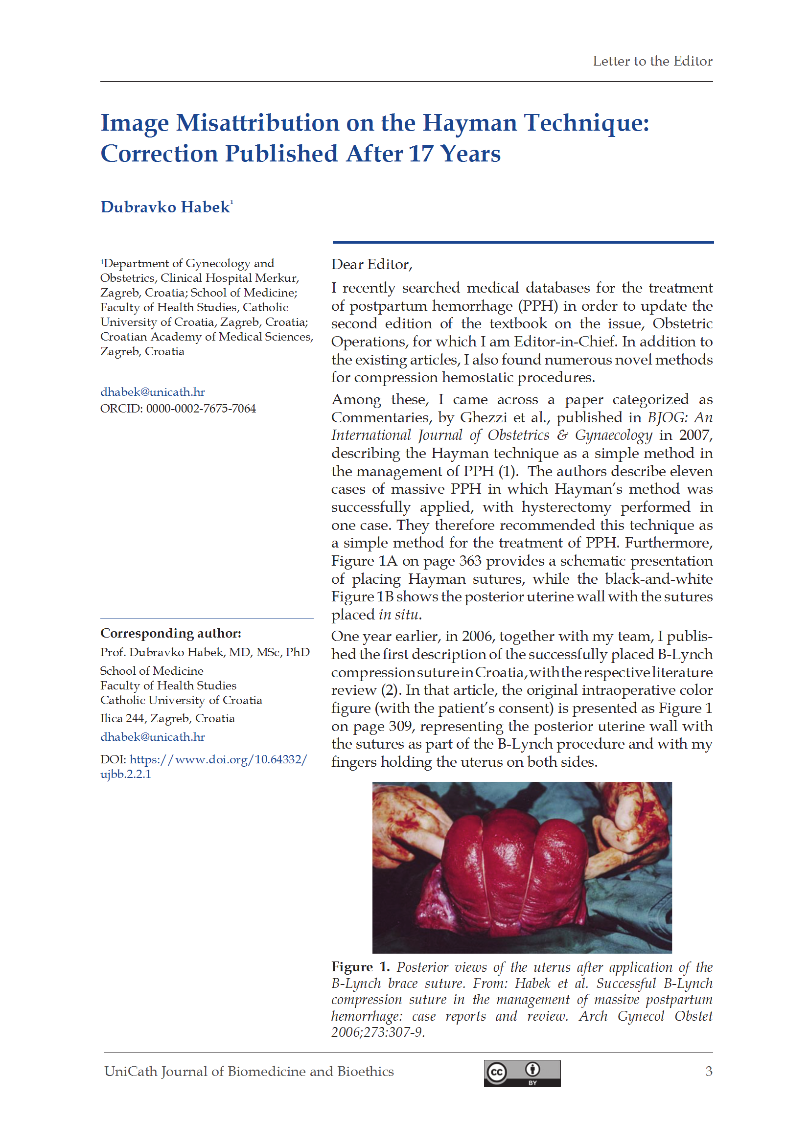 I recently searched medical databases for the treatment of postpartum hemorrhage (PPH) in order to update the second edition of the textbook on the issue, Obstetric Operations, for which I am Editor-in-Chief. In addition to the existing articles, I also found numerous novel methods for compression hemostatic procedures. Among these, I came across a paper categorized as Commentaries, by Ghezzi et al., published in BJOG: An International Journal of Obstetrics & Gynaecology in 2007, describing the Hayman technique as a simple method in the management of PPH (1). The authors describe eleven cases of massive PPH in which Hayman’s method was successfully applied, with hysterectomy performed in one case. They therefore recommended this technique as a simple method for the treatment of PPH. Furthermore, Figure 1A on page 363 provides a schematic presentation of placing Hayman sutures, while the black-and-white Figure 1B shows the posterior uterine wall with the sutures placed in situ.