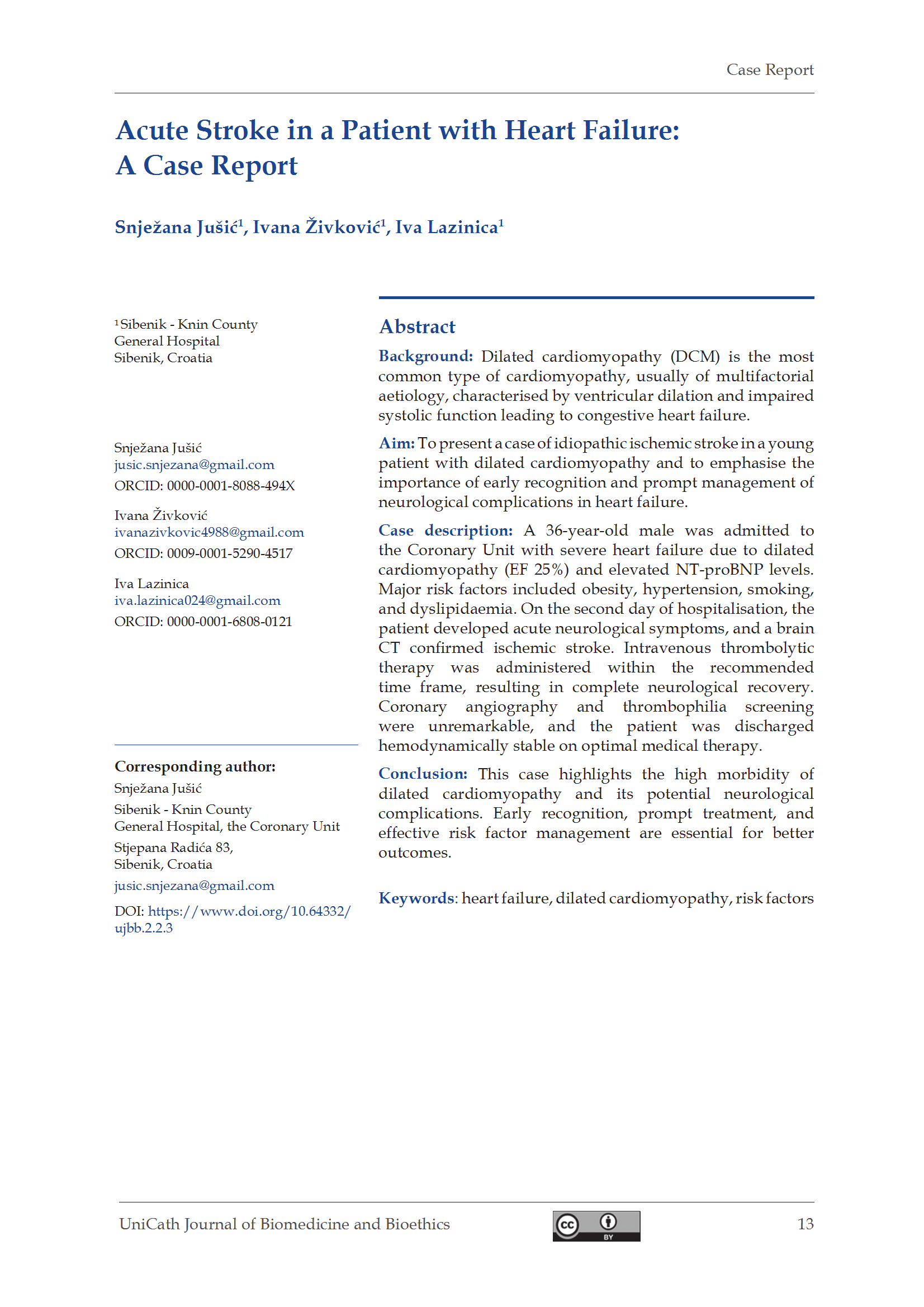 Case description: A 36-year-old male was admitted to the Coronary Unit with severe heart failure due to dilated cardiomyopathy (EF 25%) and elevated NT-proBNP levels. Major risk factors included obesity, hypertension, smoking, and dyslipidaemia. On the second day of hospitalisation, the patient developed acute neurological symptoms, and a brain CT confirmed ischemic stroke. Intravenous thrombolytic therapy was administered within the recommended time frame, resulting in complete neurological recovery. Coronary angiography and thrombophilia screening were unremarkable, and the patient was discharged hemodynamically stable on optimal medical therapy.