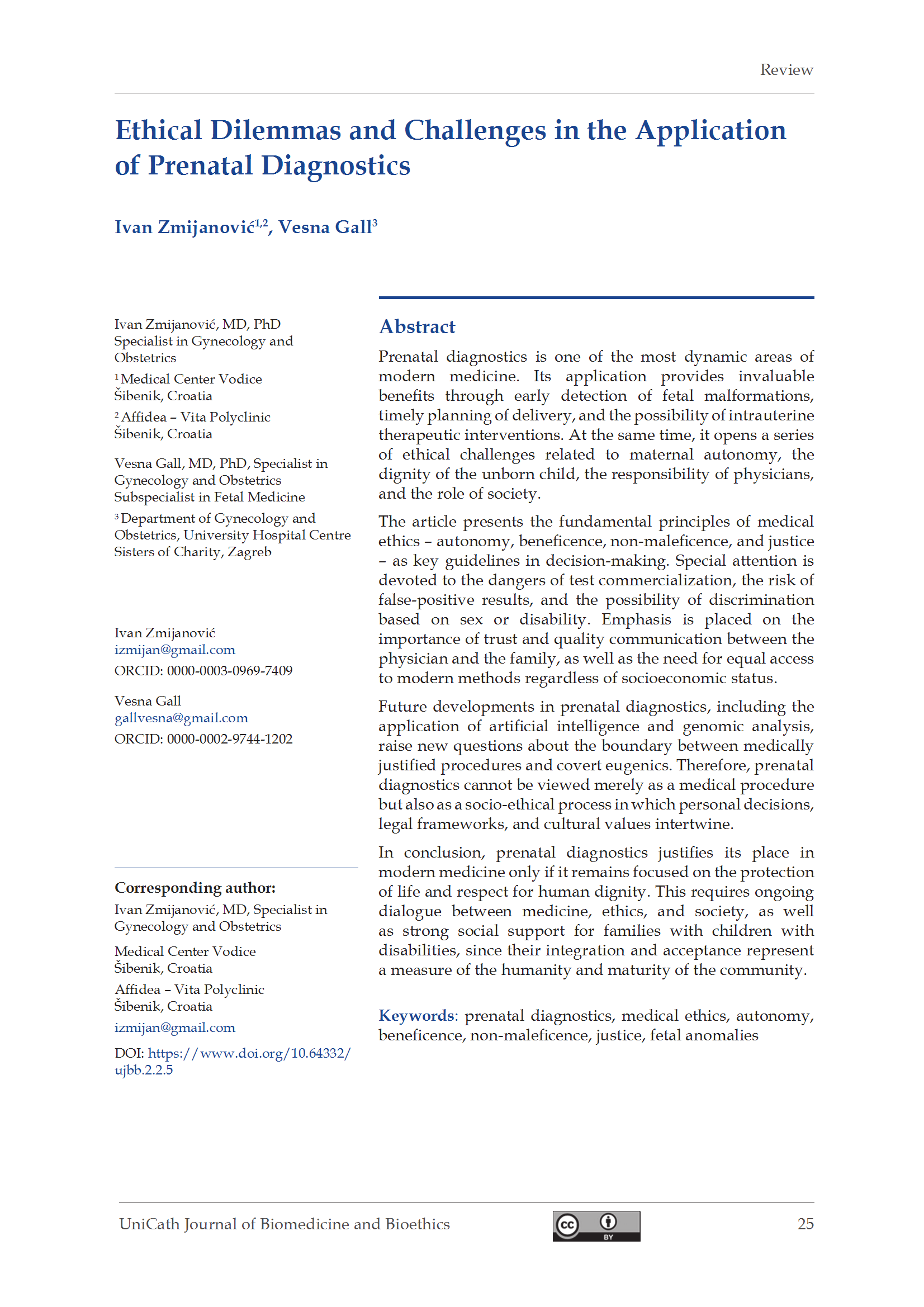 Prenatal diagnostics is one of the most dynamic areas of modern medicine. Its application provides invaluable benefits through early detection of fetal malformations, timely planning of delivery, and the possibility of intrauterine therapeutic interventions. At the same time, it opens a series of ethical challenges related to maternal autonomy, the dignity of the unborn child, the responsibility of physicians, and the role of society.