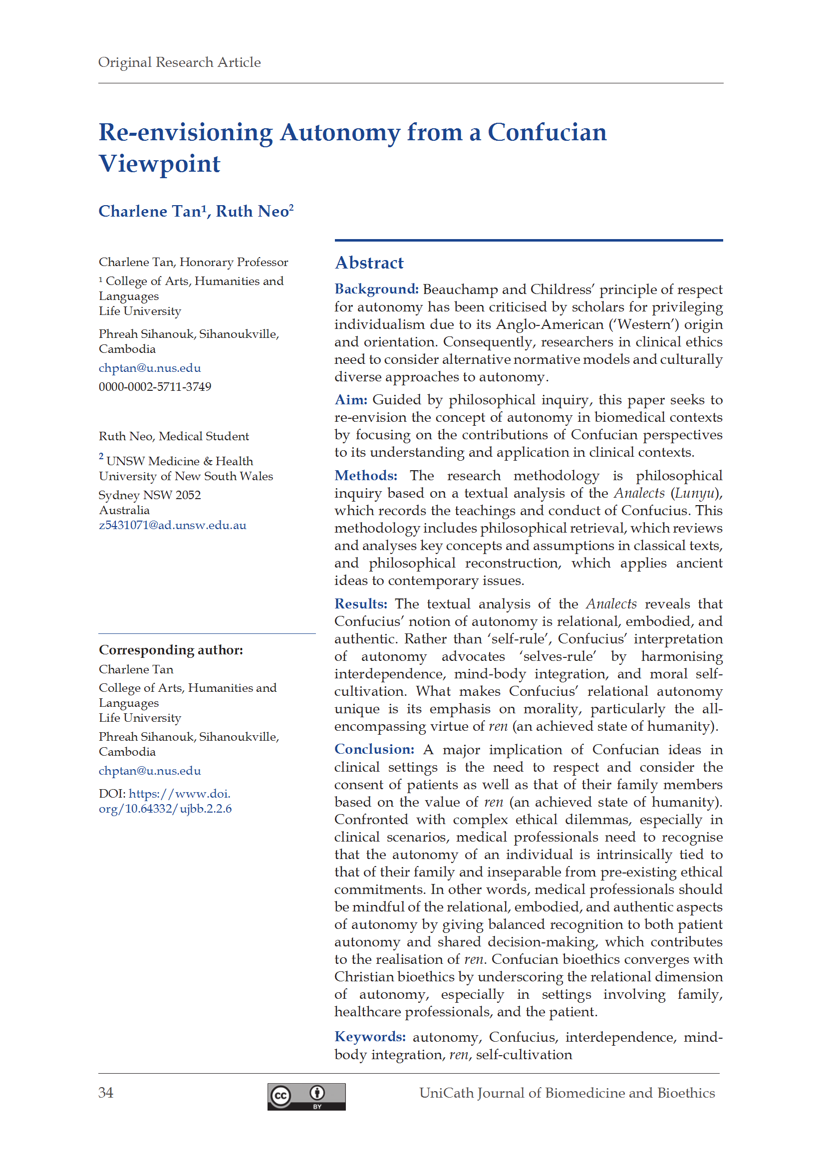 Conclusion: A major implication of Confucian ideas in clinical settings is the need to respect and consider the consent of patients as well as that of their family members based on the value of ren (an achieved state of humanity). Confronted with complex ethical dilemmas, especially in clinical scenarios, medical professionals need to recognise that the autonomy of an individual is intrinsically tied to that of their family and inseparable from pre-existing ethical commitments. In other words, medical professionals should be mindful of the relational, embodied, and authentic aspects of autonomy by giving balanced recognition to both patient autonomy and shared decision-making, which contributes to the realisation of ren. Confucian bioethics converges with Christian bioethics by underscoring the relational dimension of autonomy, especially in settings involving family, healthcare professionals, and the patient.